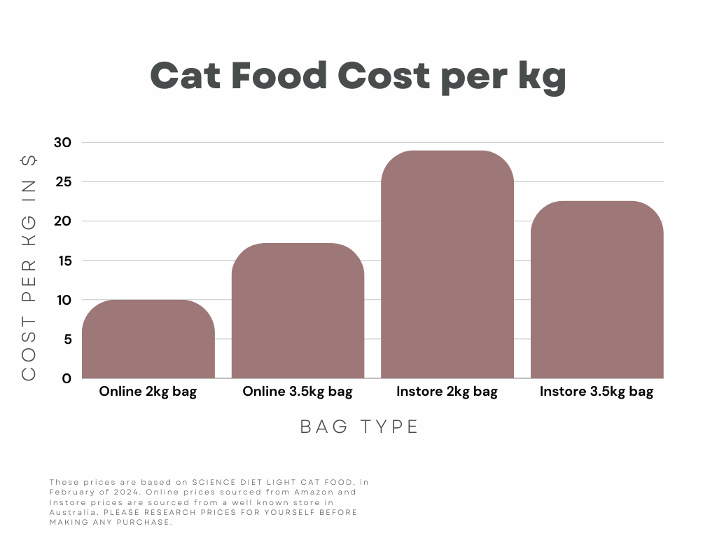 To conduct our mini study, we researched the cost of dry cat and dog foods at different sized bags to find the cost per kilogram. Specifically, we looked at Science Diet Cat food, and Supercoat Dog food.